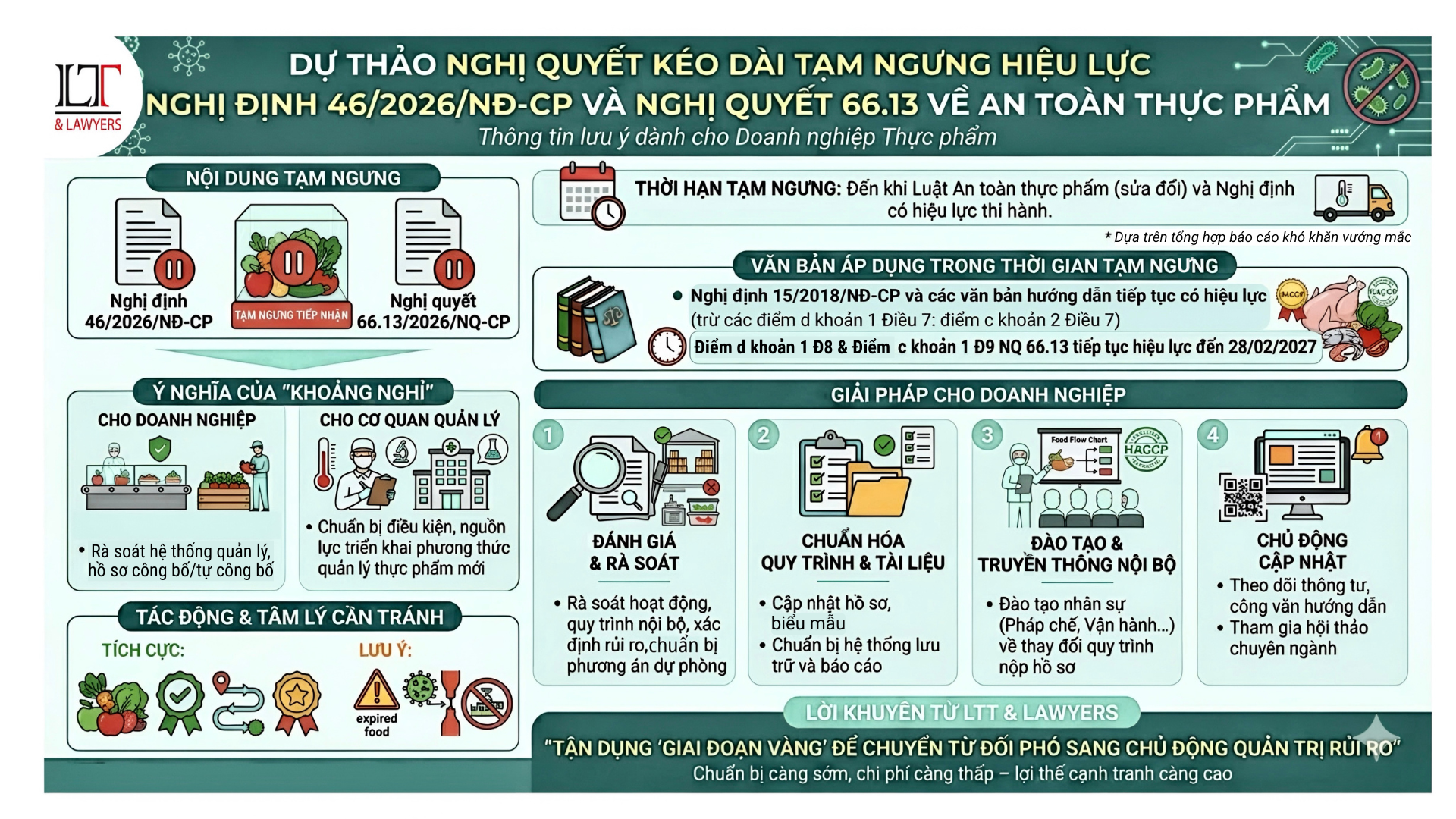 Theo thông báo mới nhất, Bộ Y tế đã dự thảo Nghị quyết về việc kéo dài thời gian tạm ngưng hiệu lực của Nghị định 46/2026/NĐ-CP (“Nghị định 46”) và Nghị quyết 66.13/2026/NQ-CP (“Nghị quyết 66.13”) liên quan đến lĩnh vực an toàn thực phẩm. Bài viết hôm nay của LTT sẽ đưa đến cho người đọc những thông tin cần lưu ý đối với Dự thảo trên!